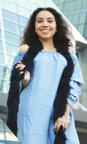 Costume accessory or fashion? Our faux fur is made of an exclusive proprietary yarn, the silkiest softest nylon in the world today. All faux fur apparel today is made of fabric not yarn. Fabric faux fur is either irritating and sticky or heavy and course. When donning a Faux Fur Happy Boa you will immediately feel the lightness, airiness and silky feeling on your skin. Our faux fur featherless boa is an irresistible feather boa replacement.